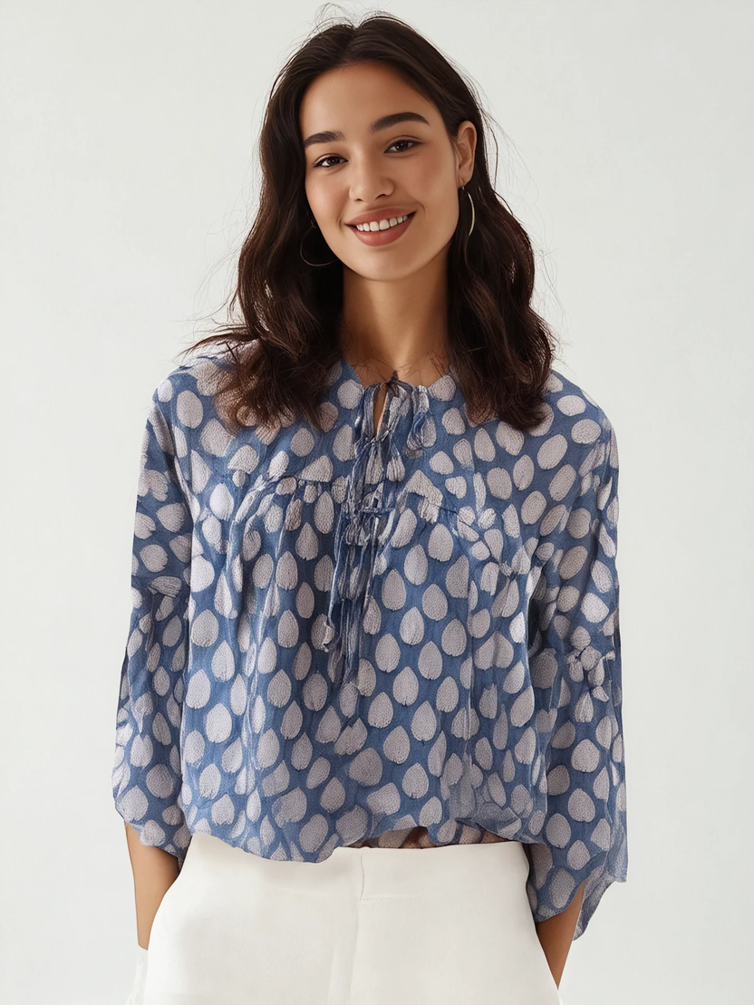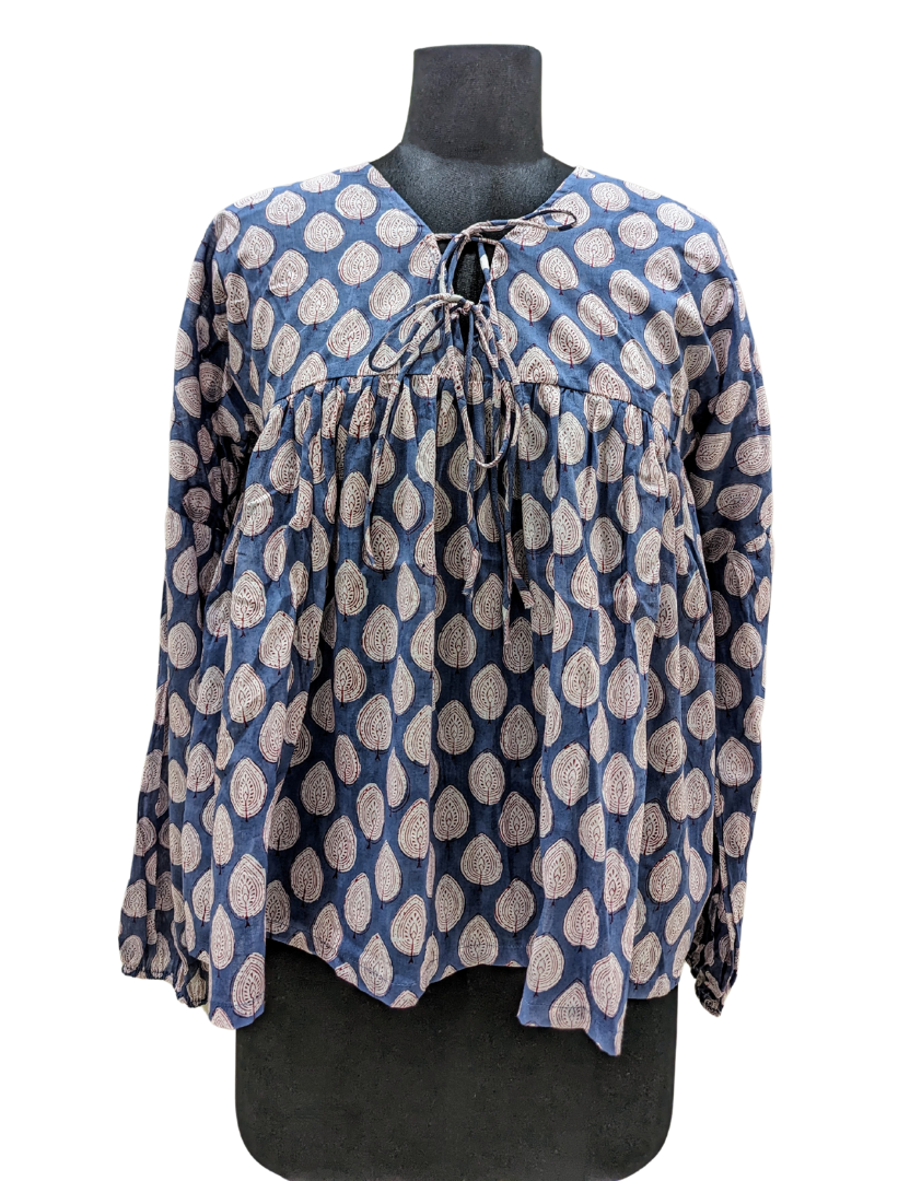 Introducing our Summer Breeze Cotton Top Blouse, where comfort meets chic sophistication. This blouse, crafted from 100% breathable cotton, features a stylish balloon silhouette for a relaxed fit and beautiful long sleeves with elastic cuffs, offering both style and functionality for your summer adventures. The elegant string detailing at the neck enhances its charm, while the skin-friendly colors and beautiful hand block print add a touch of artistry to your ensemble. Whether you're strolling and enjoying a garden party, or meeting a friend for an eveing coffee, this top ensures you stay effortlessly stylish and comfortable all season long.