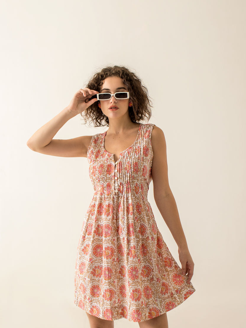 Embrace the playful nature of summer with our Citrus Garden Dress, meticulously handcrafted using traditional hand block printing. This stunning piece is made from 100% cotton, featuring an intricate floral design with pintuck details on both the front and back. A convenient string at the waist allows you to adjust the fit to your liking. Adorned with orange flowers that evoke the refreshing, citrusy vibe of summer, this dress is perfect for a picnic day or a romantic garden date. Bring the essence of a blossoming garden into your wardrobe with ANAM's beloved Citrus Garden Dress.
