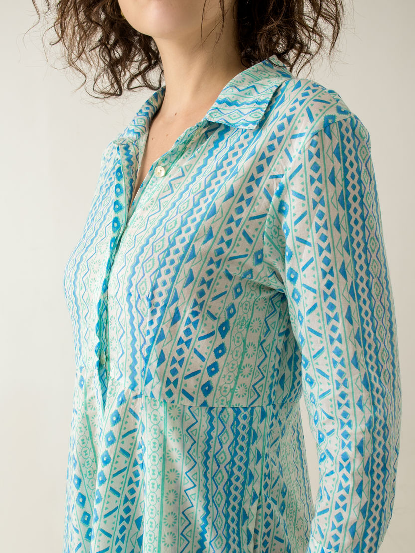 The Coastal Cove Dress is a long shirt dress made in 100% cotton using the hand block printing technique, embodying the beautiful blue-green border details that echo the easy breezy nature of a coastal region. This design delivers on ANAM's promise of combining style with comfort, offering an effortlessly chic addition to your wardrobe. Perfect for leisurely strolls or casual gatherings, the dress's breathable fabric and serene aesthetic will make you feel as relaxed as you look. Embrace the coastal vibe with this elegant and comfortable piece.