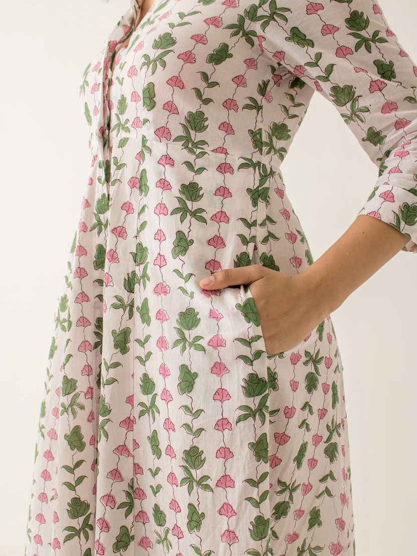 Discover elegance with ANAM's Floral Fusion Frock. This long shirt dress is 100% cotton and handcrafted using traditional hand block printing technique, featuring an intricate flower and leaf print that echoes a feminine and flowery vibe. Its casual and chic style makes it perfect for a delighful brunch or an evening stroll, effortlessly blending comfort with sophistication. Elevate your wardrobe with a piece that embodies ANAM's commitment to exceptional craftsmanship and timeless fashion.