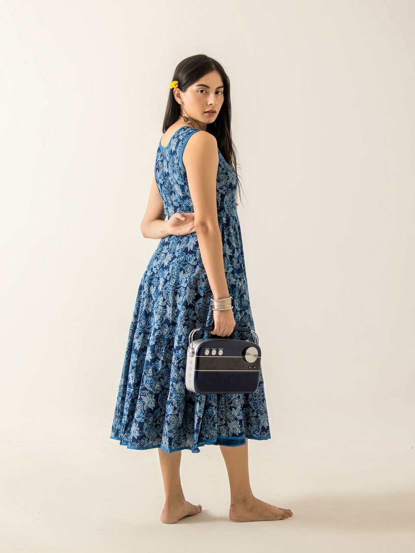 Discover elegance with the Indigo Oasis Dress, made from 100 % cotton and lovingly handcrafted using the age-old indigo block printing technique. This exquisite dress features intricate and captivating lotus patterns, a nod to the traditionally loved art form of indigo. Its long, flowy fabric ensures unparalleled comfort, making it perfect for any occasion. At ANAM, we celebrate the fusion of tradition and style, and the Indigo Oasis Dress embodies this beautifully. Step into a piece of wearable art that's both beautiful and versatile.