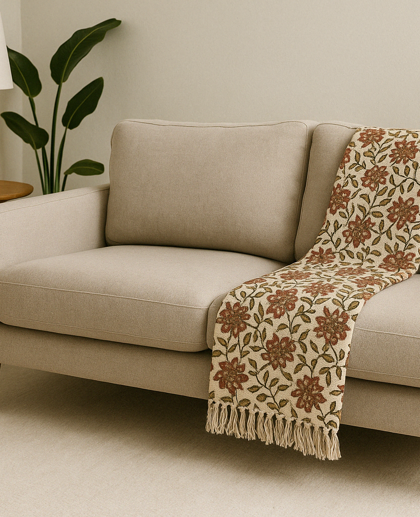 Rooted in quiet beauty, the Kalira Throw draws its name from Kali (bud) and Ira, symbolizing the Earth and gentle femininity. Hand-block printed in Bagru, its soft floral patterns bloom across a palette of dusty, earthy tones — calm, grounded, and timeless. This adds a subtle, botanical charm to your space — perfect for layering, lounging, or gifting with love.